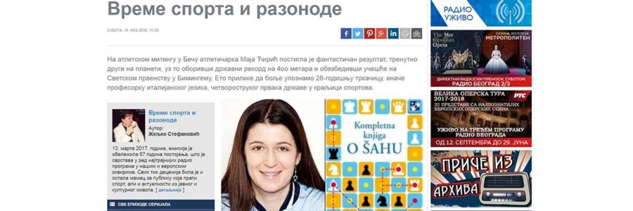 Радио Београд 1 – Време спорта и разоноде 12. februara 2018.24. februara 2018. Радио Београд 1 Емисија: Време спорта и разоноде, субота 10. фебруар 2018. Аутор и уредник: Жељко Стефановић Гост: Марија Лукић